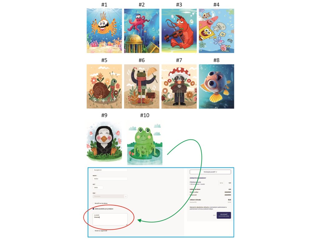 Ak tak chcete urobiť, musíte si vybrať variantu z rozbaľovacej ponuky. Pri objednaní 4, 6, 8 alebo 10 puzzle prosíme napísať nám čísla obrázkov v treťom kroku objednávky, v časti ´Zadať poznámku pre predajcov´. Napríklad, pri objednávaní sady ´1 rám so stojanom + 4 puzzle´, je potrebné zadať štyri čísla obrázkov (napr. 1, 4, 5, 9). Získate 1 rám so stojanom a 4 puzzle s obrázkami, ktoré ste označili.